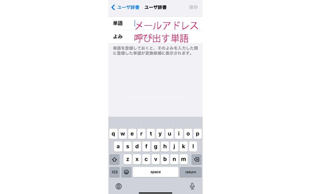 - 「辞書に追加」を選択し、メールアドレスと短いキーワードを登録。