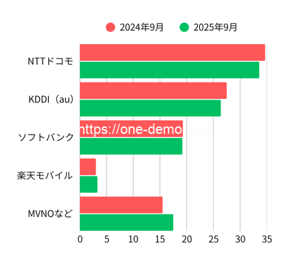 総務省の統計によると、2025年9月末時点の携帯電話契約シェアは次のような構成です。