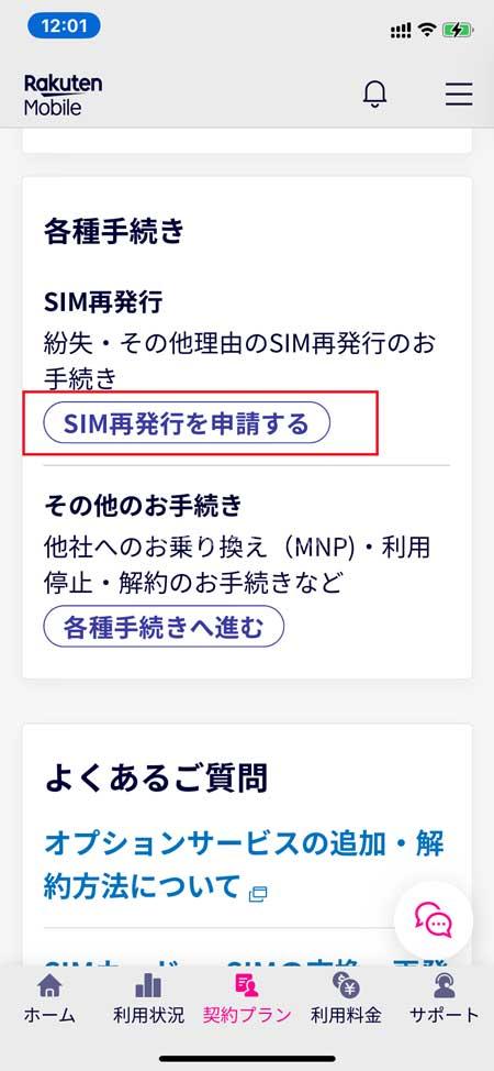1、my 楽天モバイルの画面右上にあるメニュー(三本線)をタップし、「契約プラン」を選択し、画面が変わりましたら「各種手続き」内の「SIM再発行を申請する」をタップします。