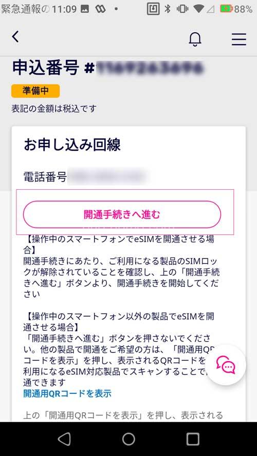 6、「楽天回線の開通手続きを行う」をタップ
