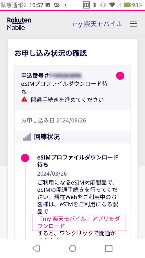 5、次にmy 楽天モバイルトップページの右上にある三をタップして、「申し込み履歴」を開くと「申込番号」が表示されているので、その右下の「>」をクリック。「my 楽天モバイル」アプリを使うとeSIMの設定が簡単なので、まだインストールしていない人はこの画面の下にある「my 楽天モバイル」アプリうをダウンロードをタップするとアプリへ飛びます。