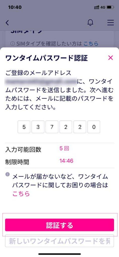3、ワンタイムパスワードを入力し、「認証する」をタップする