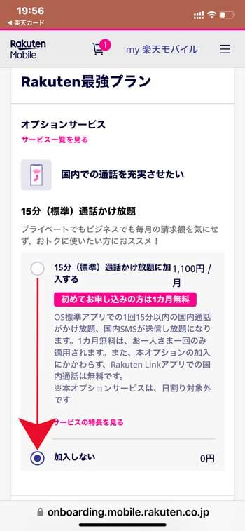 3、オプションサービス①「15分通話かけ放題に加入する」にチェックが入っているので、「加入しない」にチェックを入れ直す(初めての申し込み以外の人は1,100円かかります)