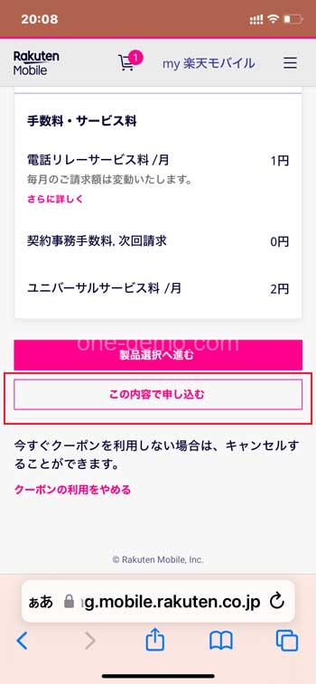 6、手数料・サービス料が表示されるので確認してスマホを同時に注文する人は「製品選択へ進む」を、SIMカードのみの注文の人は「この内容で申し込む」をタップ