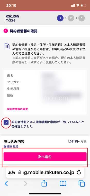 表示されている内容に間違いがなければ「契約者情報と本人確認書類の情報が一致していることを確認しました」にチェックを入れて「次へ進む」をタップ