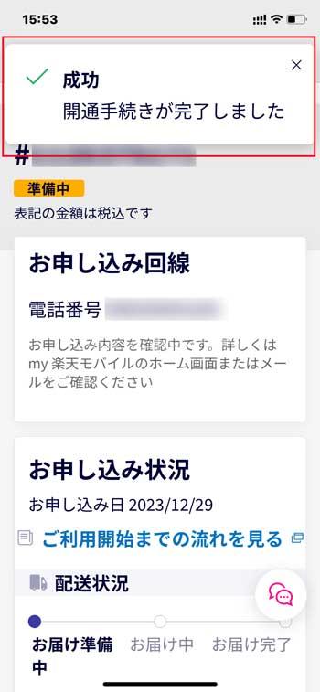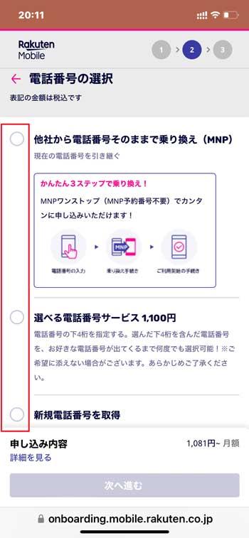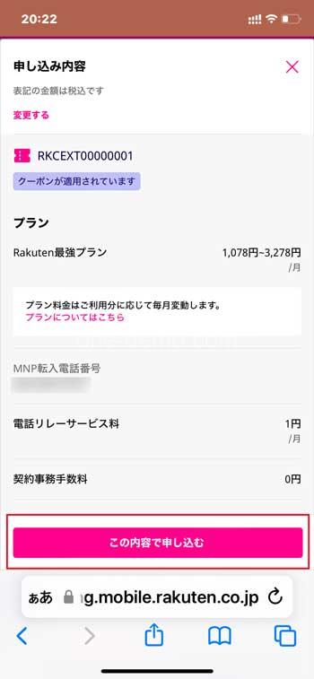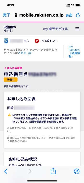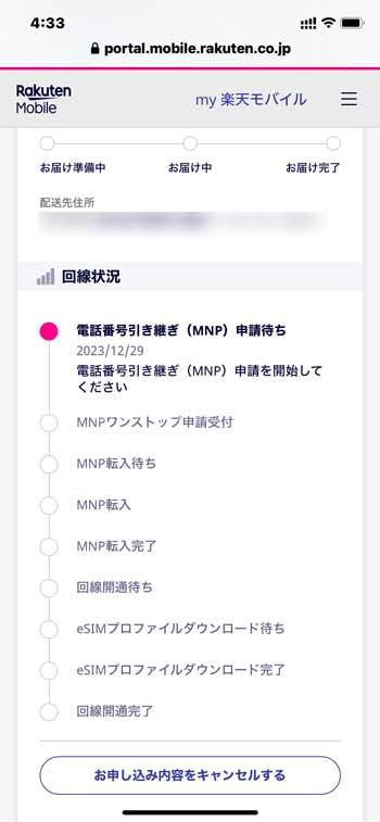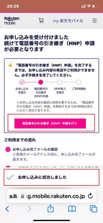 ここで楽天モバイルへの申し込みは完了です。続いてMNP申請を行います。