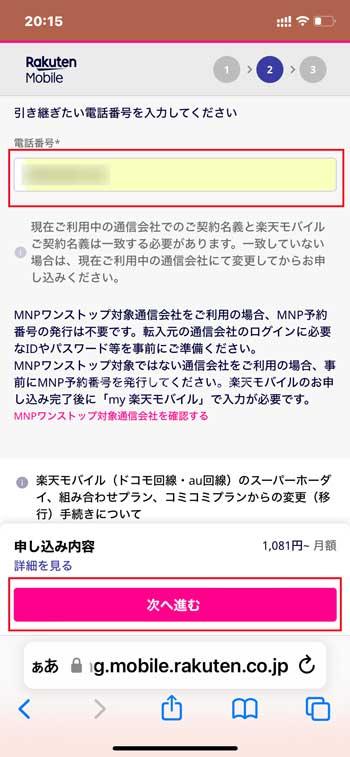 9、MNPの場合は引き継ぎたい電話番号を入力して「次へ進む」