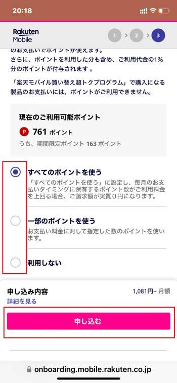 受け取り住所と支払い方法、楽天ポイントを利用するかどうかを確認して「申し込む」をタップ(申し込み内容はボタンの左上にある「詳細を見る」をタップすると見ることができます)
