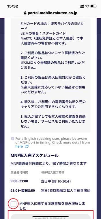 18、楽天モバイルに再度ログインし、申し込み履歴から「MNP転入の手続き開始の前に」のページを確認し、「MNP転入に関する注意事項を読み理解した」にチェックを入れ、一番下までスクロールして「MNP転入の手続きを開始する」をタップ